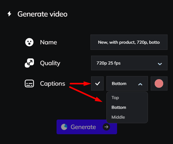 - Enter a name for your video and select the resolution. You can also enable captioning by ticking the caption box and choosing the position of the caption.