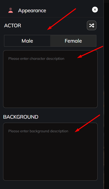 Here, you’ll need to choose your avatar’s gender, provide a description of how the avatar should appear, and enter a background description that sets the scene for your avatar.